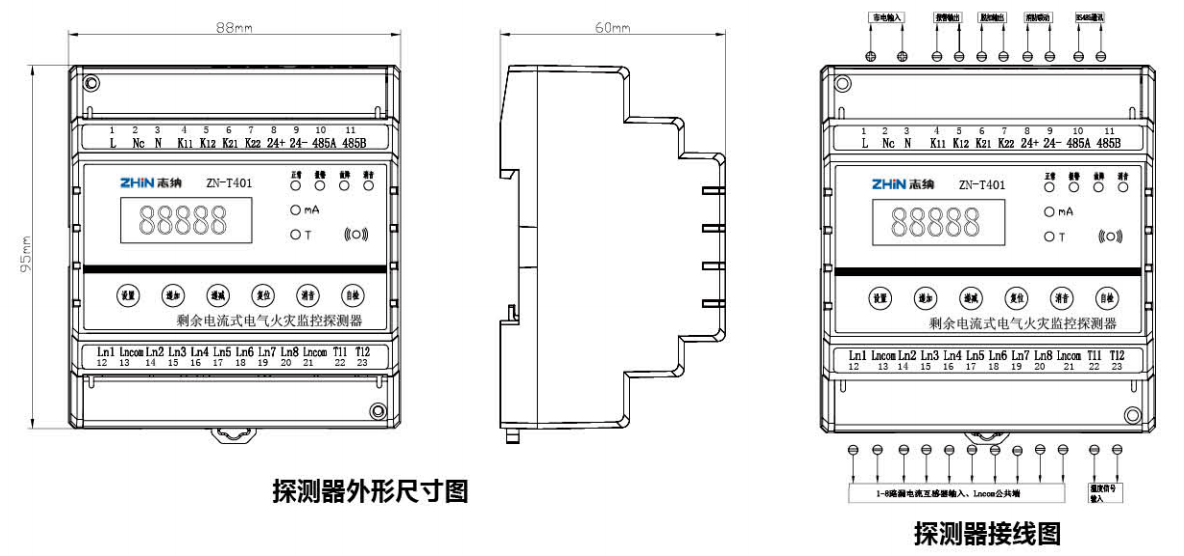 ZN-T401系列探测器可以同时对回路的漏电流、温度集中显示与监控,可将数据上传至电气火灾监控设备或消防中心,并可多台探测器与电气火灾监控设备组网或与消防系统组网,实现远程切断负载电源,及时阻止电气火灾的形成及蔓延。